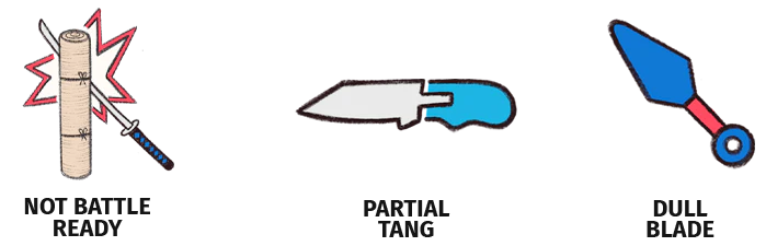 This product is Not Battle Ready, Partial Tang, and a Dull Blade. This means it is great for cosplay enthusiasts and display.